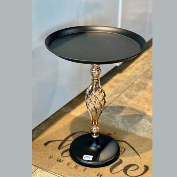nA stylish round side table featuring a sleek black tray top and a decorative gold metal stand with intricate openwork design. Its modern yet elegant look makes it perfect for placing in living rooms, bedrooms, or entryways as a functional and decorative piece.
