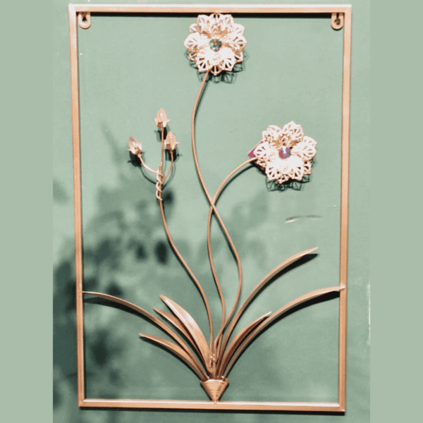 Decorate your personal space with this attractive wall accent. Centred with a beautiful floral structure, this rectangular-shaped decor item features a frame and a hook detail at the back for the comfortable fixture on the wall. Furthermore, it displays a metallic finish and has excellent durability.